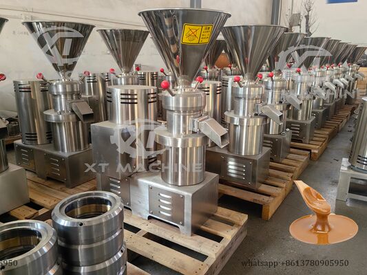 우리의 콜로이드 밀은 고도의 밀링 기술을 이용합니다. 로스트된 땅콩이 중력, 환경 압력, 그리고 원심력으로 기계로 들어갑니다.기하학적 모양의 스테이터와 고속으로 작동하는 로터 사이의 변형 고리 썰기 틈은 강한 절개를 발생이 과정은 효과적으로 분산, 분쇄, 융화, 균일화,그리고 땅콩을 고품질의 땅콩 버터로 균일하게 처리합니다..